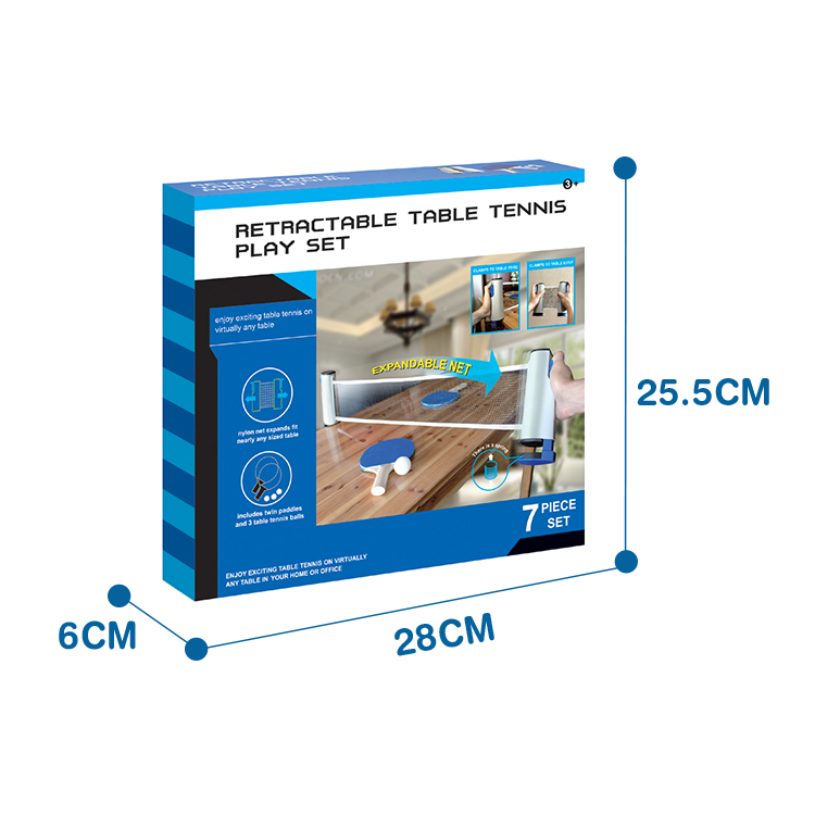 Características :Juego de tenis de mesa retráctil con 2 palas y 3 pelotas, que incluye una red de nailon expansible que se adapta a casi cualquier tamaño de mesa. La red ajustable con resorte se sujeta firmemente a los bordes de la mesa, lo que lo hace adecuado para niños a partir de 3 años. Perfecto para diversión en interiores, este set portátil de ping pong permite que varios jugadores disfruten de emocionantes partidos juntos, fortaleciendo vínculos mientras promueve el juego activo.